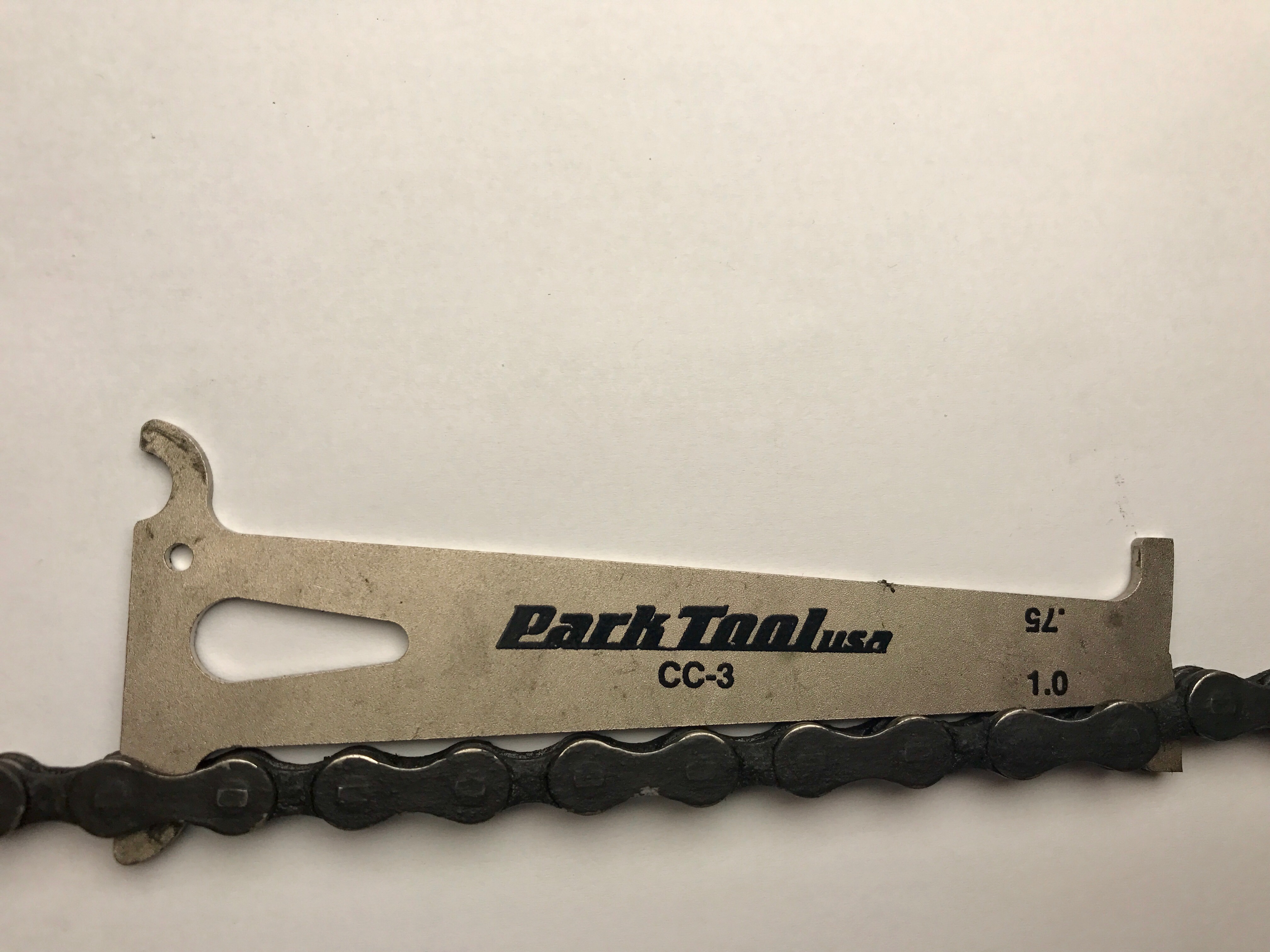 Für den Fall, dass ihr keine Verschleißlehre in eurem Werkzeugrepertoire habt tut es auch ein Messschieber. Nehmt dazu einfach einen vordefinierten Abstand von 10 Kettengliedern, schiebt den Messschieber gegen die Bolzen der Kette und messt den Abstand: