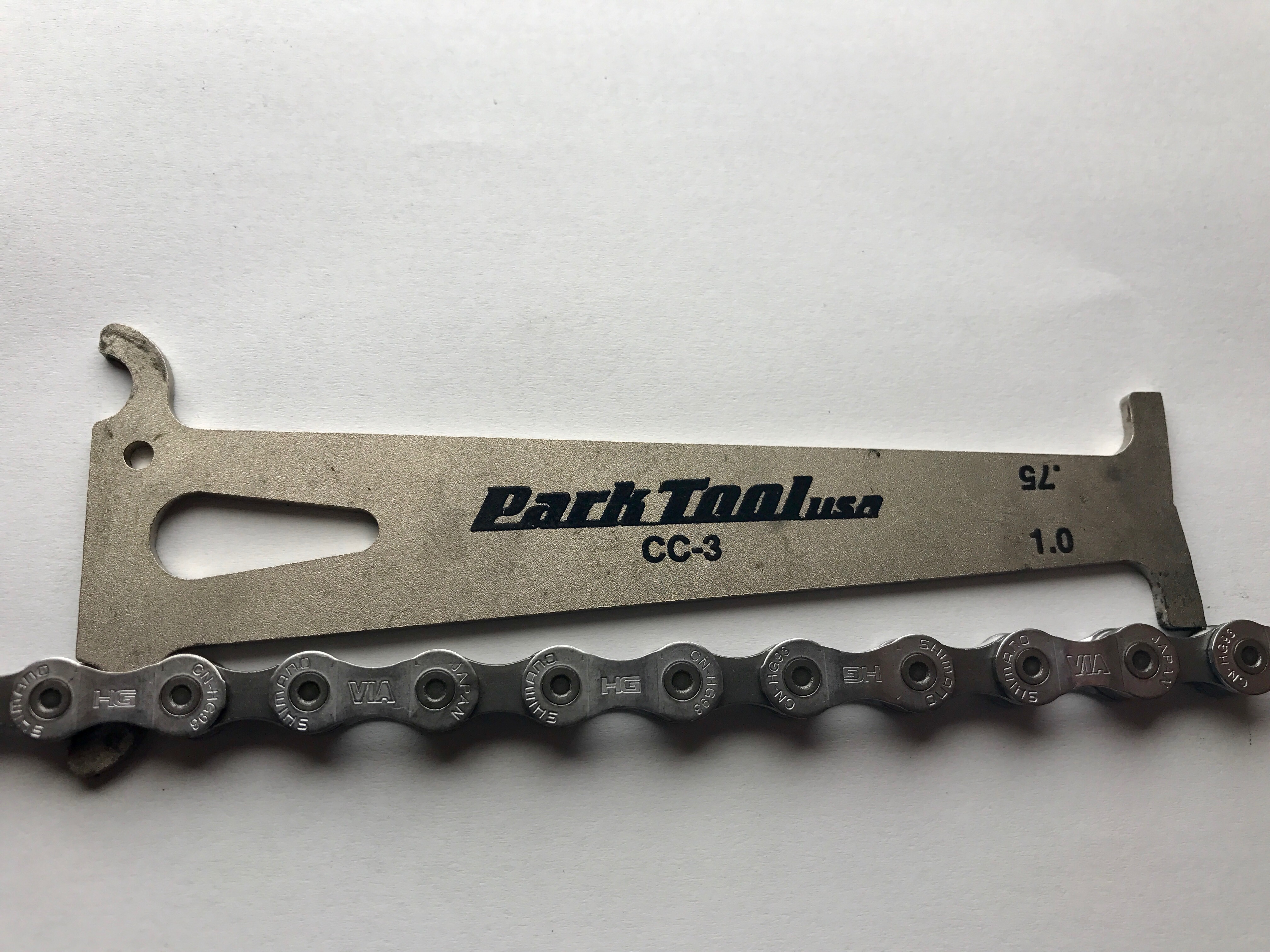 Für den Fall, dass ihr keine Verschleißlehre in eurem Werkzeugrepertoire habt tut es auch ein Messschieber. Nehmt dazu einfach einen vordefinierten Abstand von 10 Kettengliedern, schiebt den Messschieber gegen die Bolzen der Kette und messt den Abstand: